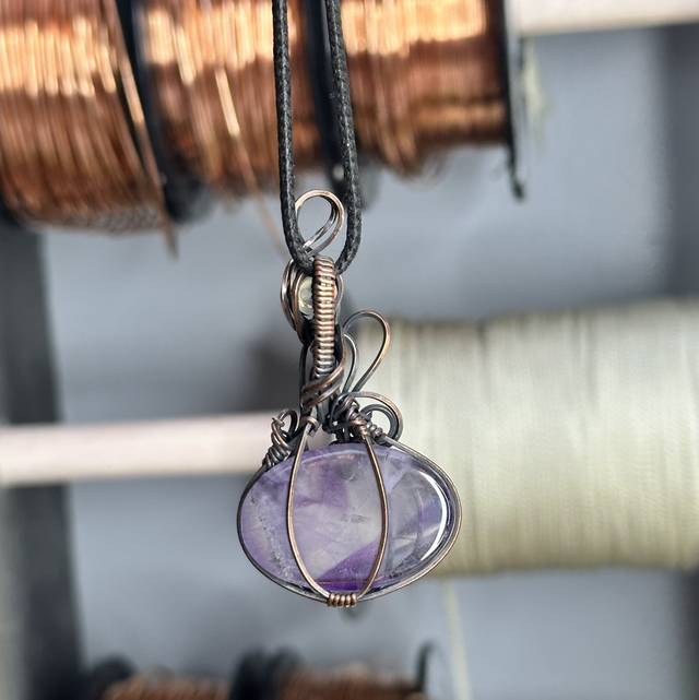 This stunning pendant features a rare Amethyst Trapiche gemstone from Brazil, showcasing unique natural patterns. The gemstone is carefully wrapped in pure copper wire, which has been oxidised to bring out the intricate wirework and provide a rustic, vintage-inspired finish. With an Ethiopian Opal encased in the weave bale.Designed with both elegance and durability, the pendant is paired with a black cord, making it ready to wear or gift.