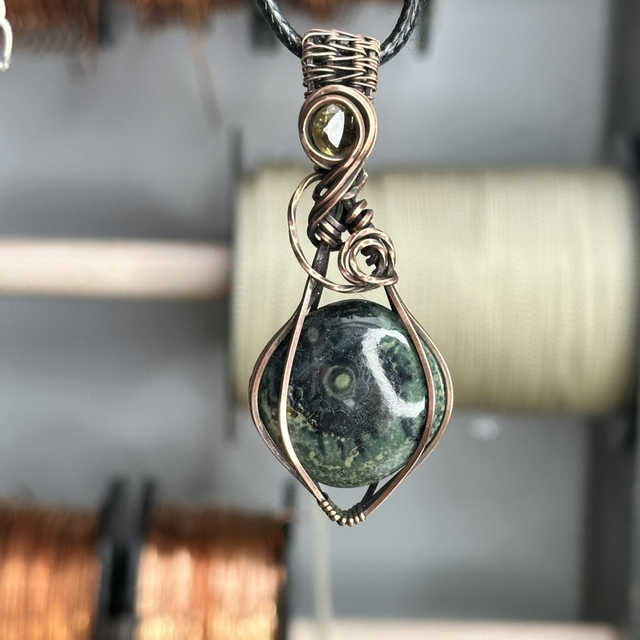 This elegant wire-wrapped pendant features a polished Kambaba Jasper gemstone, renowned for its soothing green and black swirls, said to evoke calming energies and ancient wisdom. The design incorporates a stunning citrine accent, adding a touch of golden brilliance to the piece. Suspended on a durable black cord, this pendant is both striking and versatile, perfect for everyday wear or as a statement accessory.