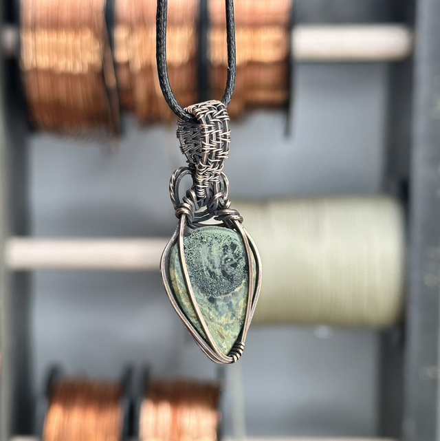 Discover the beauty of this one-of-a-kind Kambaba Jasper pendant, meticulously handcrafted with copper wire in an elegant swirl design. This striking gemstone, known for its rich green and black orb patterns, is set securely in a custom wire wrap, showcasing its natural beauty and uniqueness.