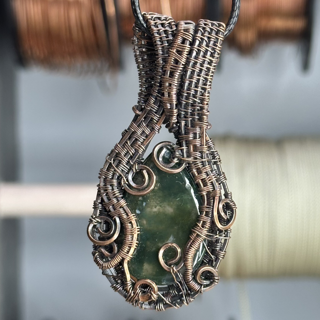 “Embrace the natural beauty of this handcrafted Moss Agate pendant, featuring a stunning pear-shaped gemstone with captivating green hues and natural inclusions. The Moss Agate is wrapped in oxidised pure copper wire, showcasing a meticulous woven design with a rich, antique-inspired finish. Adding a touch of luxury, a faceted Citrine gemstone is set in the bale, providing a warm golden accent that perfectly complements the earthy tones. The back of the pendant features elegant swirling details, highlighting the artisan’s exceptional craftsmanship. This unique piece comes complete with a durable black cord, ready to wear or gift.